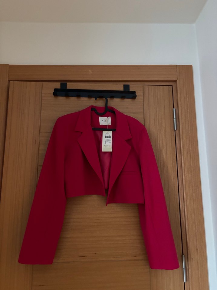 pembe renk, uzun kollu, düğmeli, normal boy midi kadın blazer ceket. Minimalist ve sokak stiliyle ofis kullanımına uygundur.