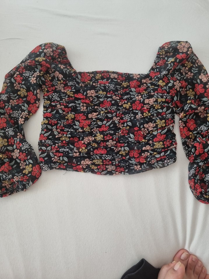 Butik ürünü, s/m beden ile uyumlu, kolları tül, bel kısmı lastikli, çicek desenli bohem bluz/crop
