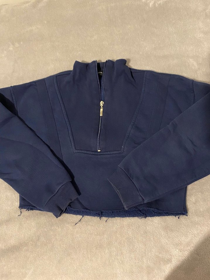 Kadınlar için yüksek yakalı fermuarlı, uzun kollu. Yumuşak kumaştan, kesik etek ucu detaylıdır. Lacivert renkte, gündelik kullanım için uygundur.