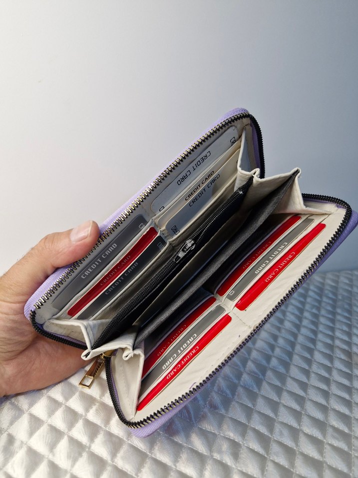 suni deri / lila renk / fermuarlı / 12 kart bölme / 1 fermuarlı bölme / kapalı hali 20×11 cm