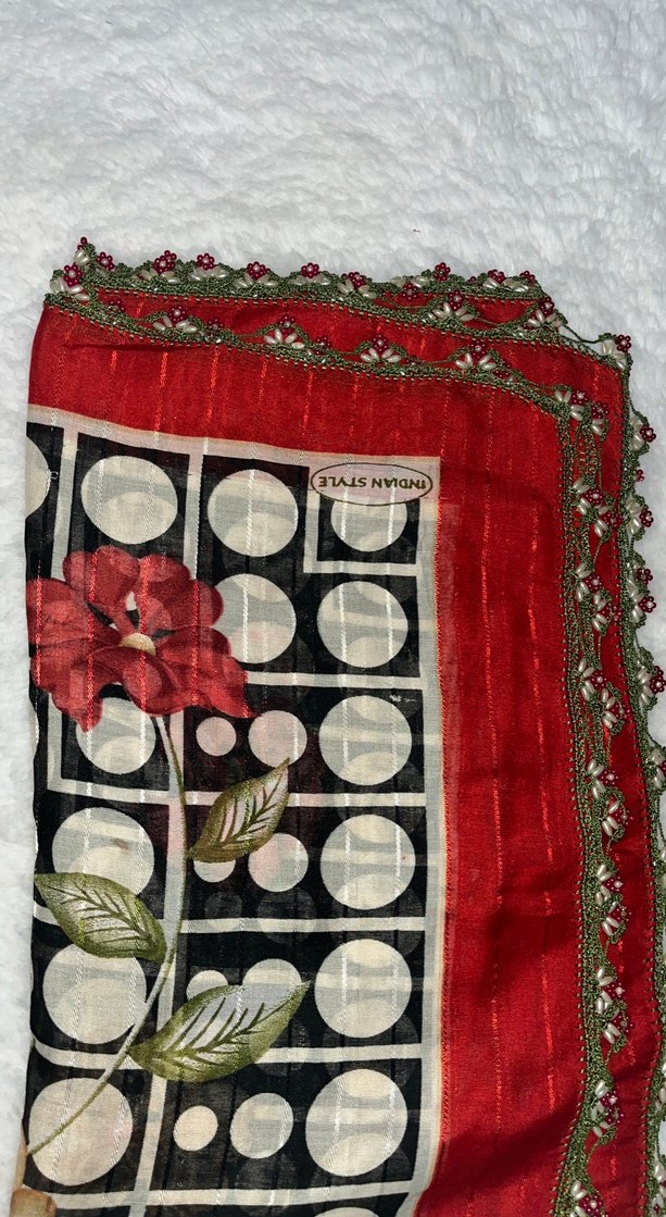 Kırmızı renkli, dantel detaylı vintage tarzda kadın fular. Çiçek ve geometrik desenlere sahip, bohem ve retro havası yansıtıyor.