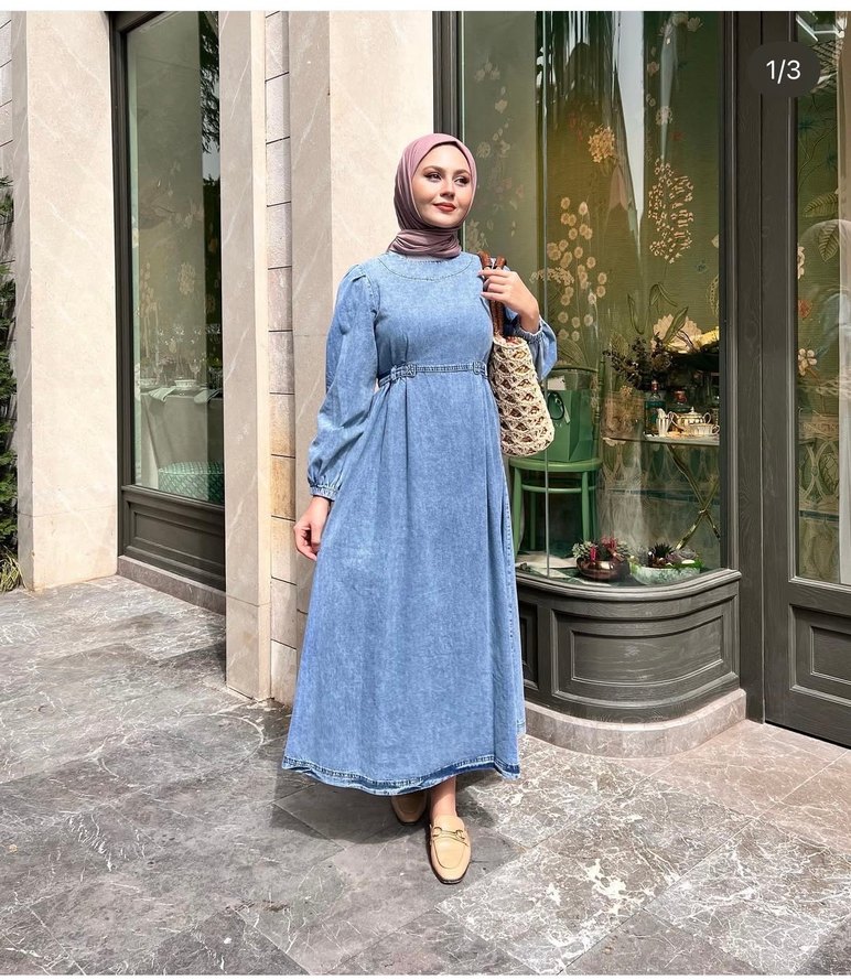 Kadın denim balon kol tesettür elbise