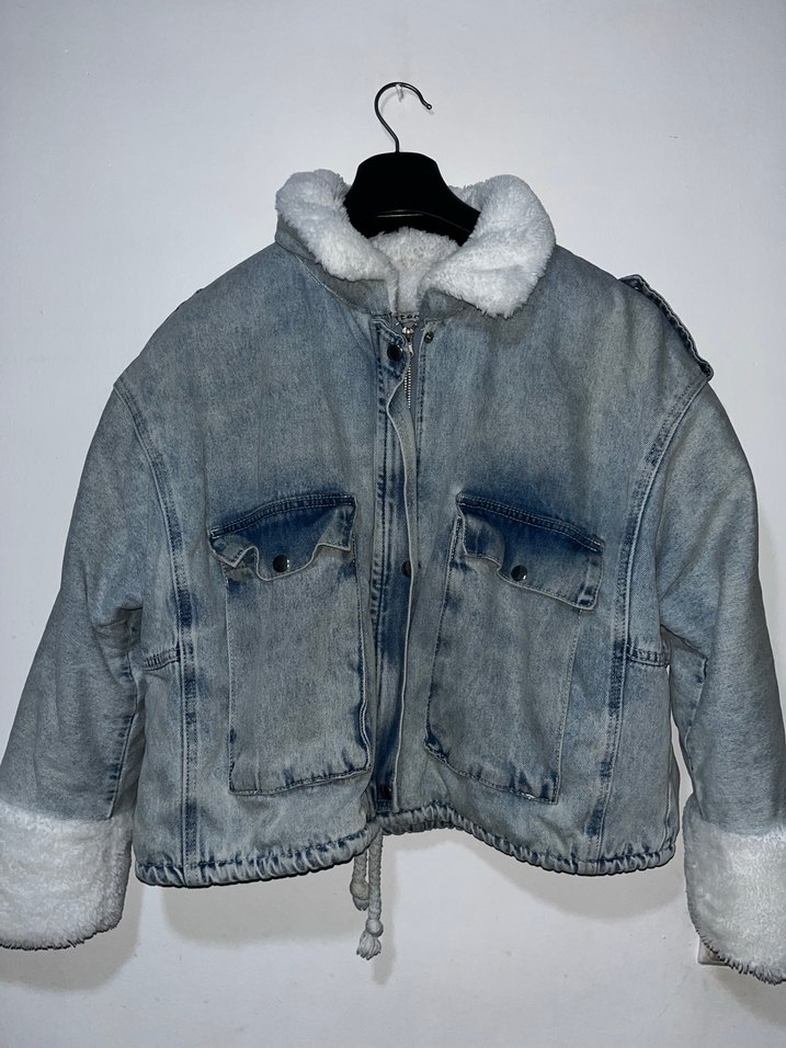 tüylü detaylara sahip, normal boy, loose fit mavi denim ceket. Notlu yakası ve uzun kolludur, günlük kullanıma uygundur.
