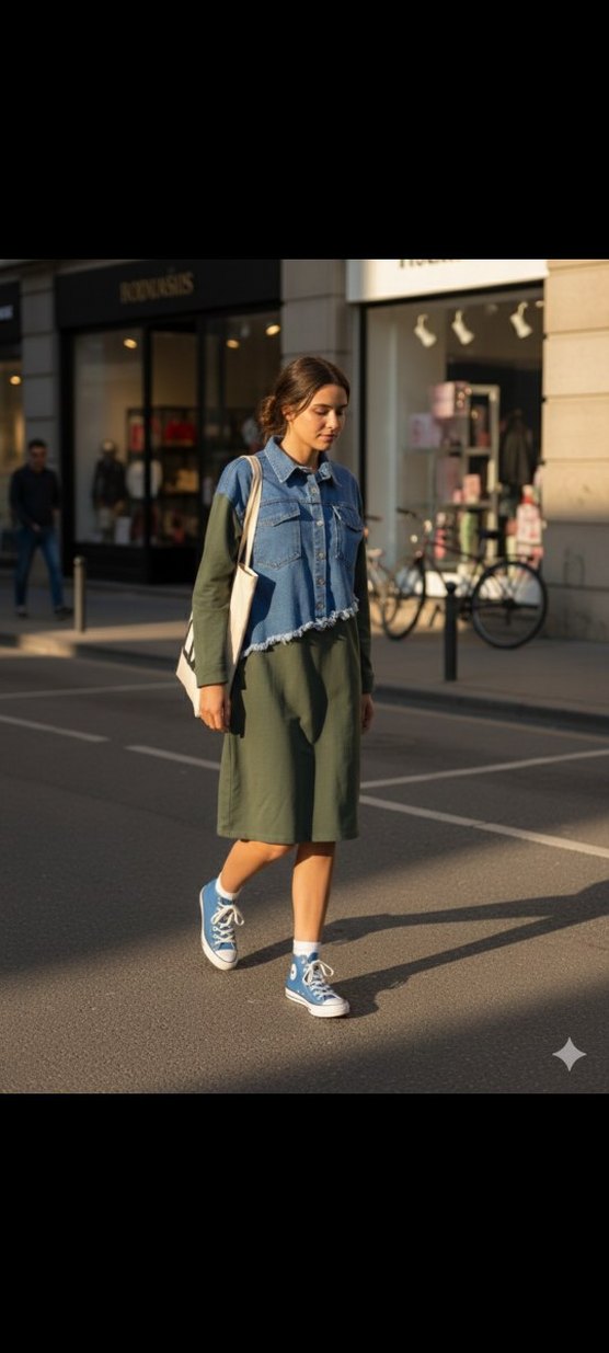 Salaş kesim, midi boy kadın denim ceket, notched lapel ve tie-dye desenli, günlük sokak stili için uygun.