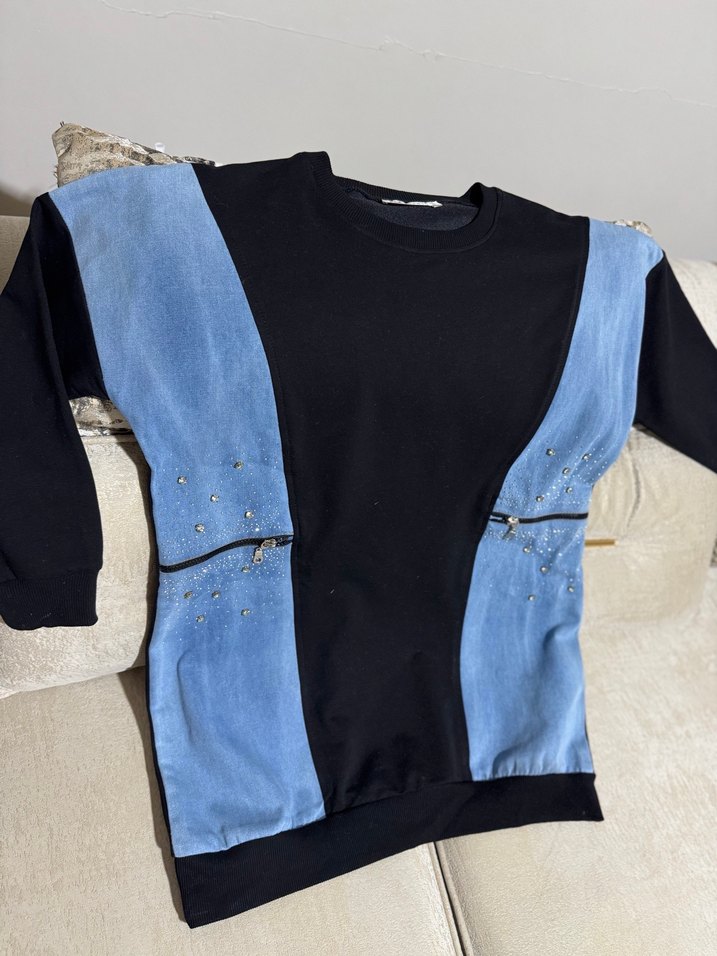 Kadın sweatshirt, uzun kollu ve yuvarlak yakalıdır. Bol kesim, kısa boy ve koyu mavi-siyah denim panellerle fermuarlı cepler ve metal detaylar içerir. Yepyeni 1-2 defa giyildi boyu kısa geliyor bana diye satıyorum boyum 1.70 tuniğin ölçüleri görsellerde mevcut. Ölü teklifler etmeyin