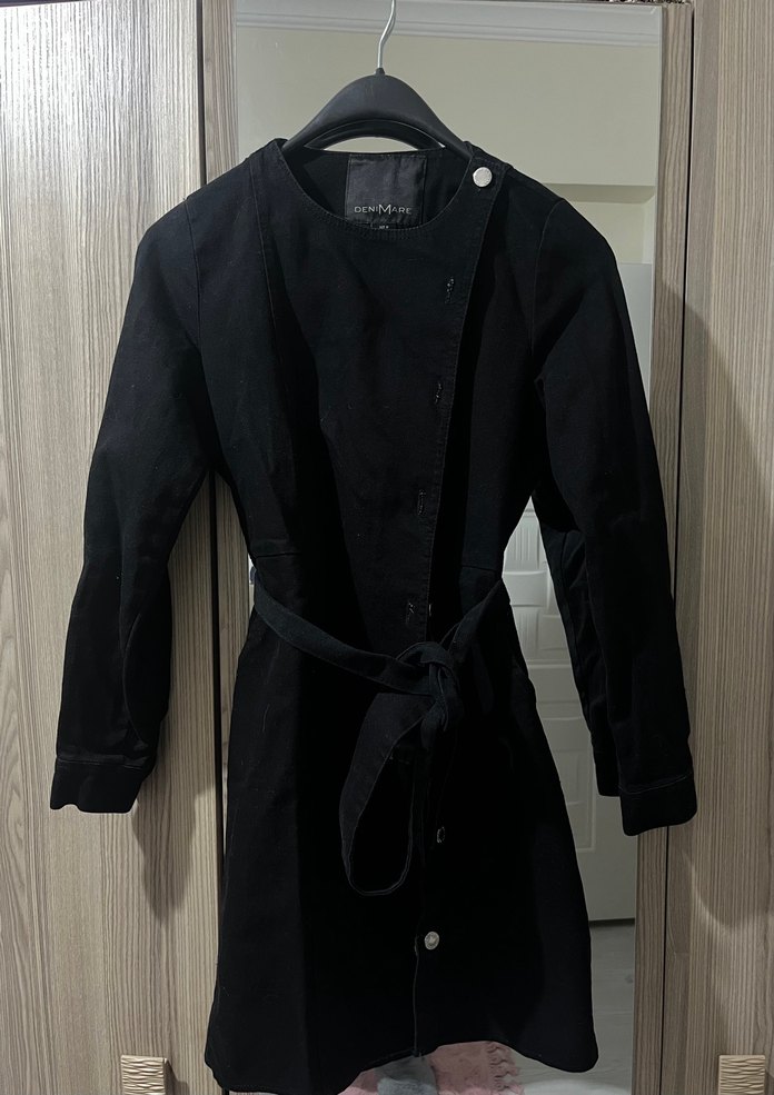 Siyah kot kumaştan yapılmış, kemerli ve mini kadın elbise. Uzun kollu ve düz desensizdir, rahat kesime sahiptir.