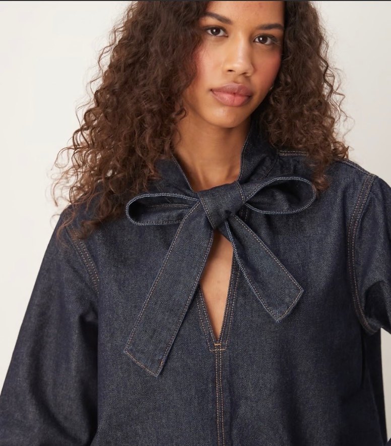Kadınlar için denim ceket, halter yaka ve fiyonk detayıyla uzun kolludur. Normal midi boyda ve regular fit, parlak renkte günlük kullanım için uygundur.