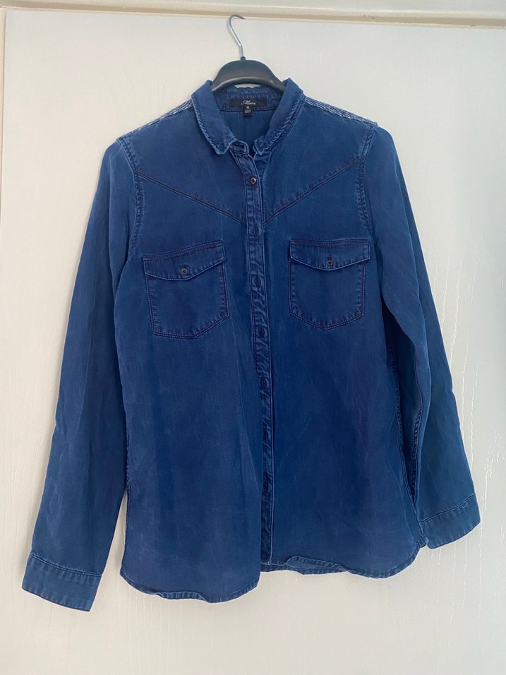 Lacivert renkli, düğmeli ön kısmı ve uzun kollu denim gömlek. Sorunsuz