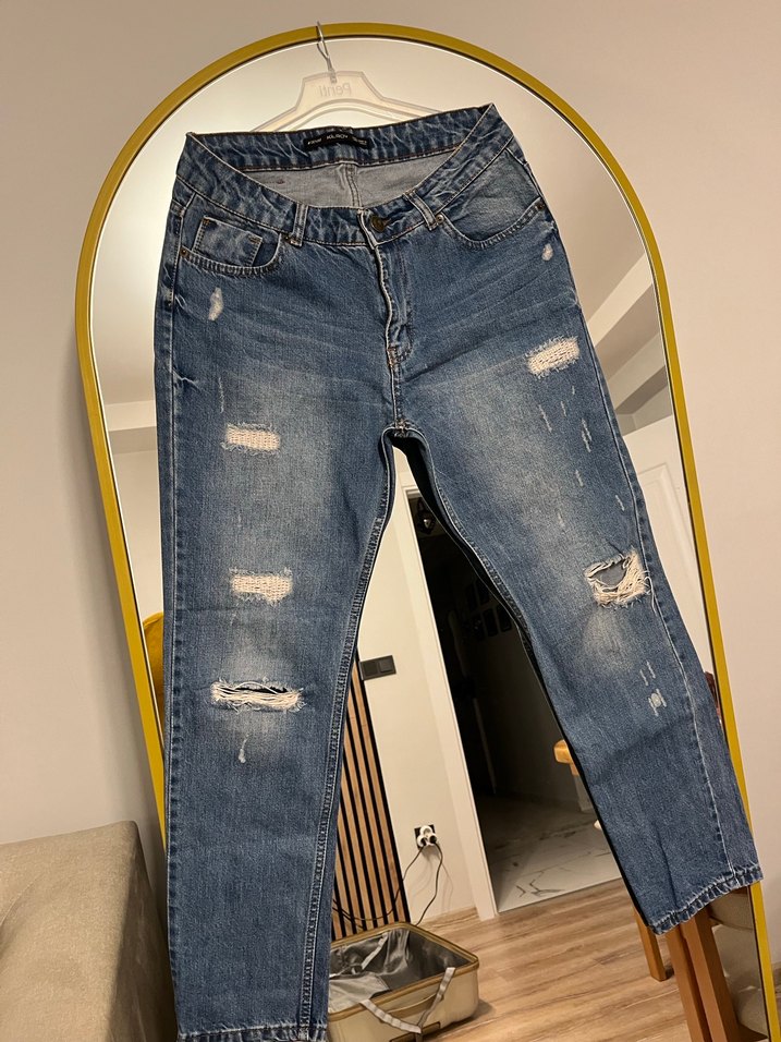 mavi denim jean, tokalı detaylı, günlük kullanıma uygun rahat sokak stili midi boy pantolon. 29 beden