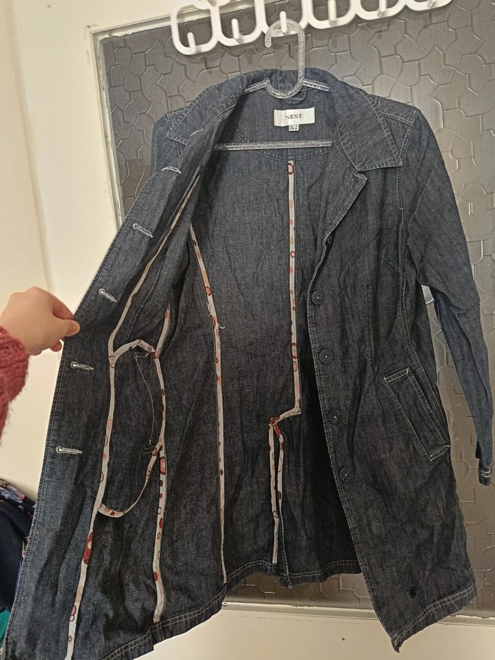 Mavi renkte, düğmeli ve normal boyda kadın denim cekettir. Notlu yakalı ve uzun kolludur, rahat bir kesime sahiptir.