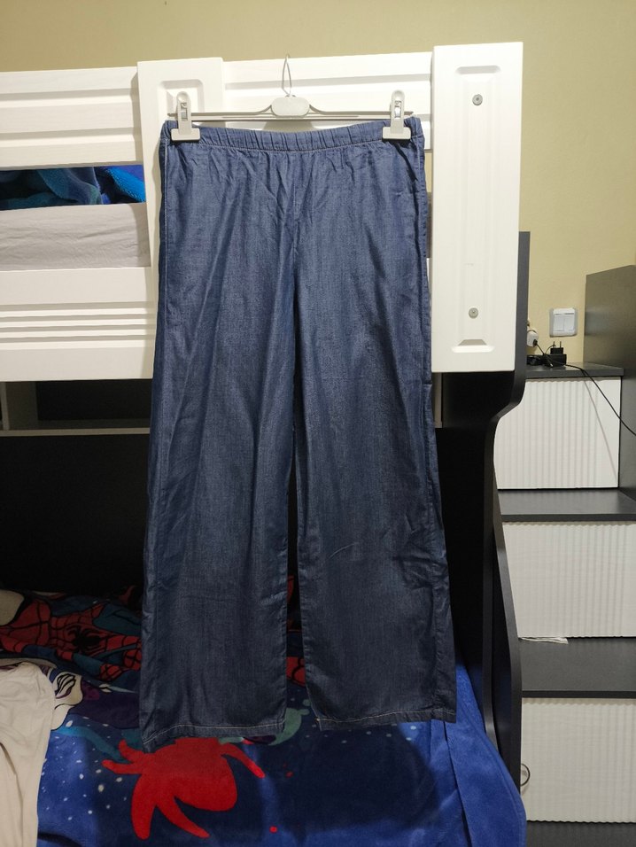 mavi tonlarda, kemerli, bol kesim, midi uzunlukta kadın denim pantolon. Günlük sokak stili için uygundur.