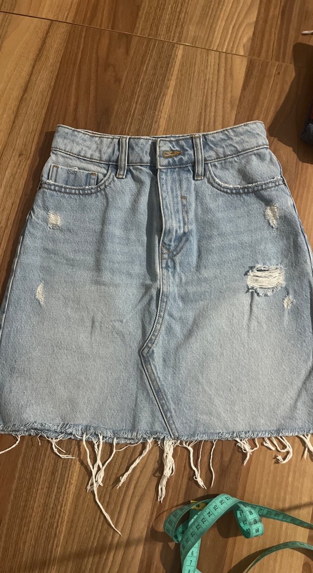 Bej renkli denim midi etek, rahat kesimi ve yıpratılmış detaylarıyla günlük kullanıma uygun, zahmetsiz şıklık sunar. Kenarları kesik ve salaş tarzda.
