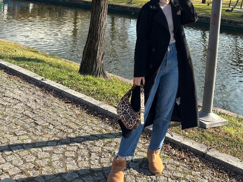 Camel renkli kadın denim kaban, leopar kürk detaylı, açık yaka ve bol kesim. Midi boy, askılı kollarıyla günlük sokak stiline uygun.