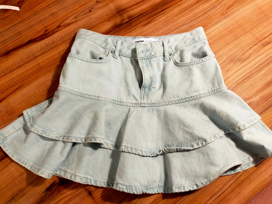 Günlük kullanım için bol kesim, pileli detaylı bej denim mini etek, rahat ve trend bir tarz sunar.