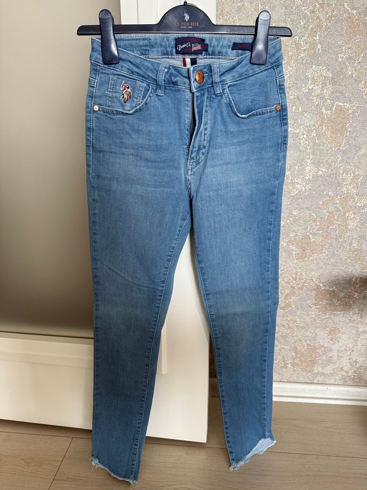 Açık mavi dar kesim likralı bir modeldir çok az giyildi paçası kendinden orijinal kesik detaylıdır. Beli:30 cm uzunluğu 92 cm paça genişliği 11 cm dir.