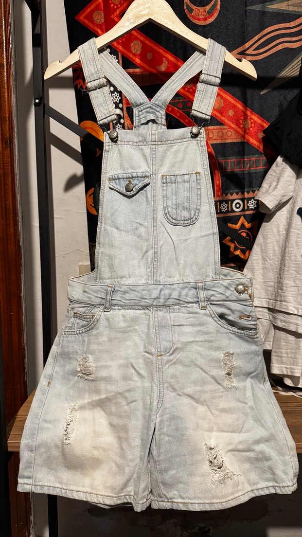 kısa tulum, ayarlanabilir tokalı askılar ve yırtık detaylarla günlük rahat stil için uygun.