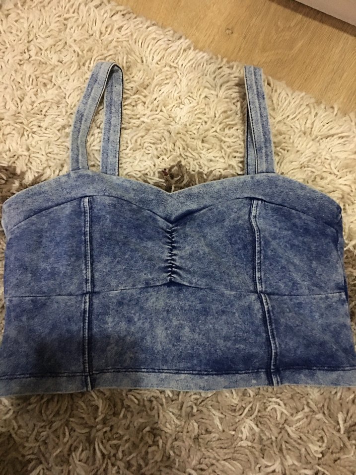 Mavi denim, strappy askılı, kürklü detaylara sahip, bohem ve rahat tarzda, günlük kullanıma uygun fitted büstiyer.