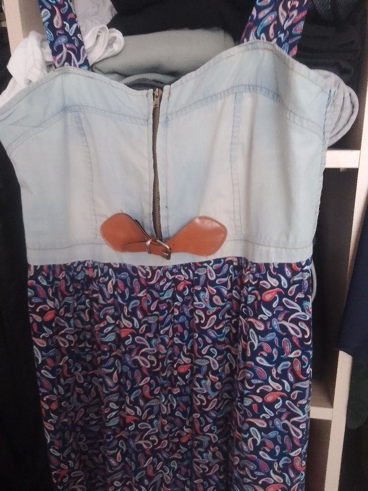 Bu dar kesim mini elbise, fermuarlı straplez denim üst ve renkli tie-dye desenli etek kısmına sahiptir, gündelik kullanım için uygundur.