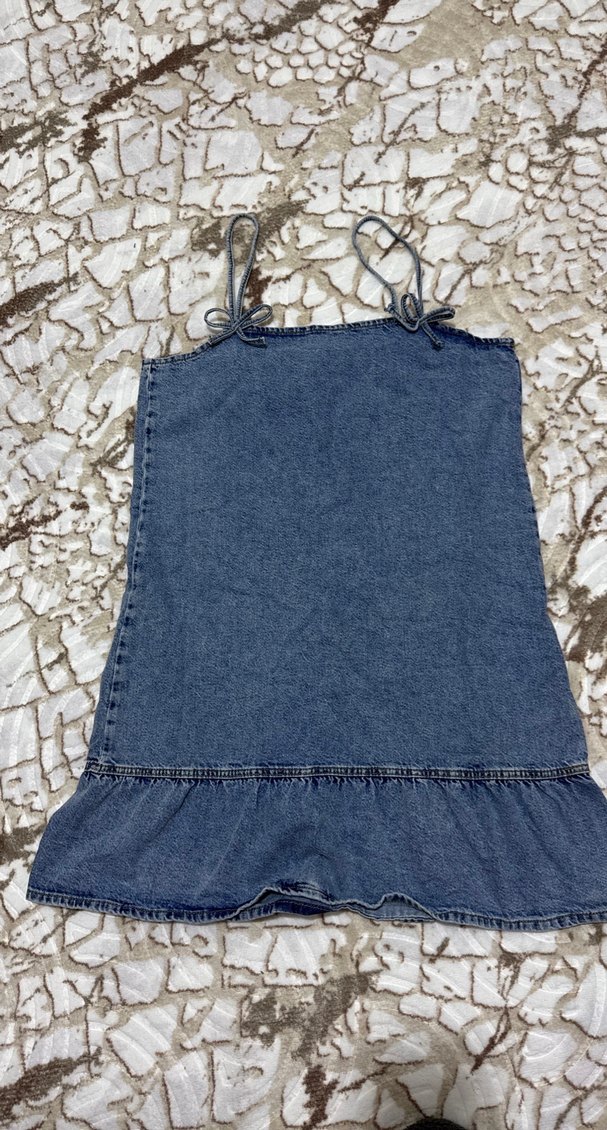 Askılı, volanlı etek ucu ve bol kesimli denim mini elbise. Bohem tarzıyla günlük kullanıma uygun.