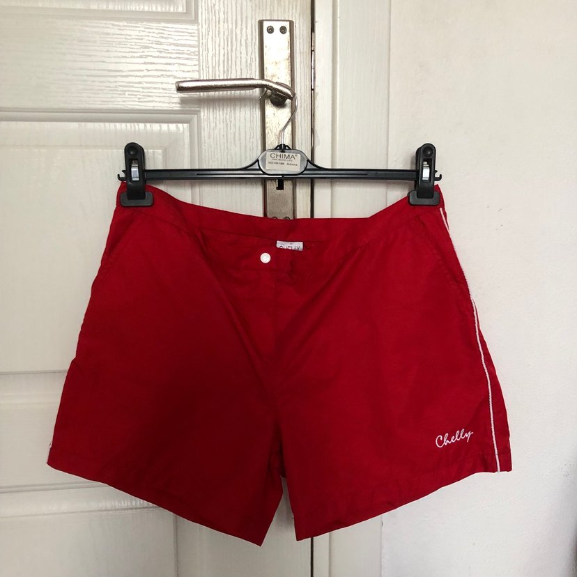 Düğmeli, parlak kırmızı renkte, dar kesim kadın deniz şortu. Desensiz ve 'Chelly' markalı, plaj ve sokak stili için uygun.