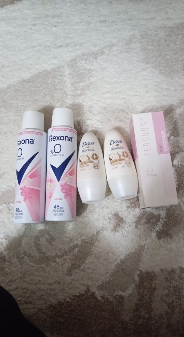 Rexona musk kokulu kadın sprey deodorantlar, Dove roll-on deodorantlar ve Peterson kadın parfümü içeren çeşitli kokular sunan set.