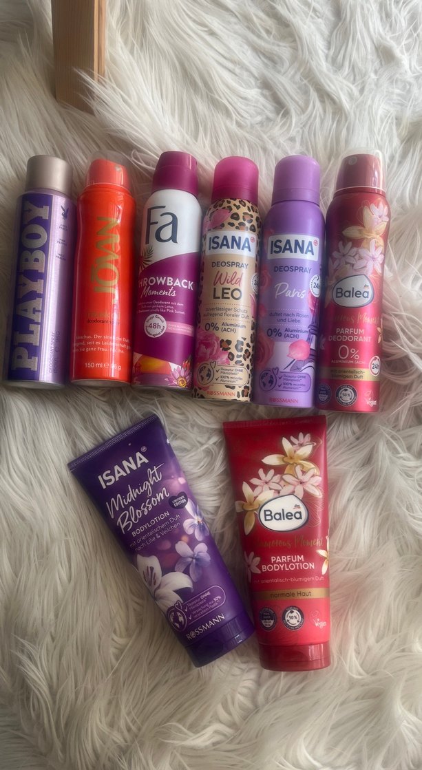 Balea, ISANA, Fa ve ROWBACK markalarından çeşitli kokularda alkol içermeyen kadın deodorantları ve vücut losyonları seti. Fiyat sorun deo : 180 kremler : 260