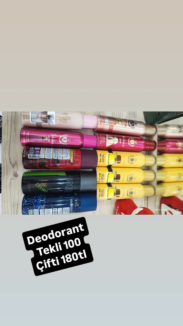 Kadın deodorantları tekli 100 TL, çiftli 180 TL fiyatlarla satışta. Farklı kokular mevcuttur.