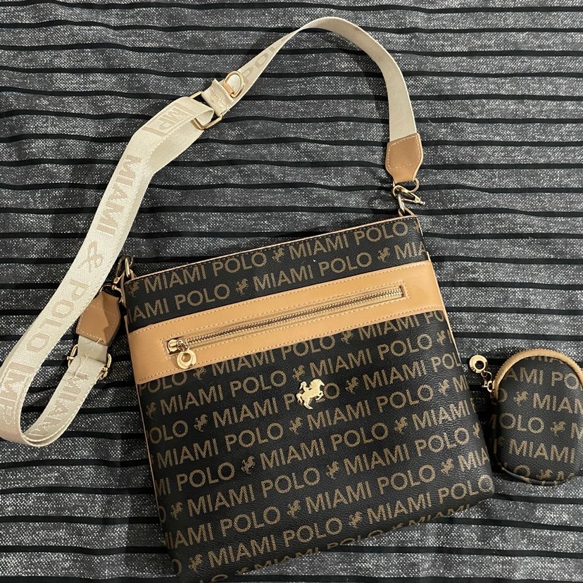 Koyu kahverengi deri çapraz çanta, baskılı MIAMI POLO deseni ve fermuarlı ön cep içerir. Ayarlanabilir askılı,günlük ve sokak stili için uygun.