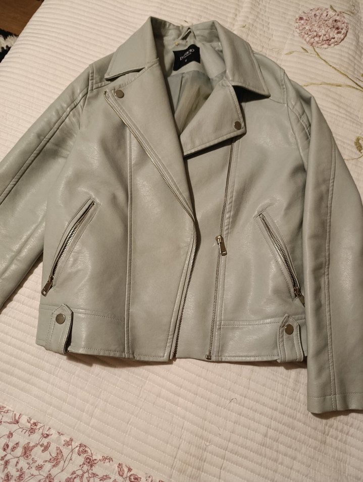 Gri deri biker ceket, çıtçıtlı yakalı ve fermuarlı ceplidir. İnce kesim, normal boy ve askılı kollara sahiptir, trend gündelik kullanıma uygundur.