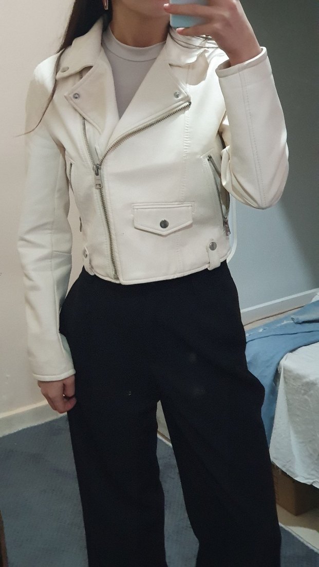 Bu beyaz deri ceket, oturmalı kesimi, yaka detayları ve tokalı tasarımı ile dikkat çekiyor. Askılı kollara ve midi boy uzunluğa sahip, günlük kullanıma uygun. Beyaz olanda bir problem yok 500 siyah olanın fermuarı bozuk yaptırılabilir herhalde dişlerden birinde problem var sanırım hatırlamıyorum 350
