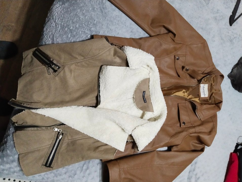 Fermuarlı ve çıtçıtlı, parlak bej deri, uzun kollu, normal uzunlukta, kesim oturan kadın ceket. kürklü kadın yelek