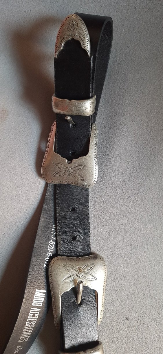 Siyah deri kayışa sahip, gri tokalı, vintage tarzda kadın kemeri.