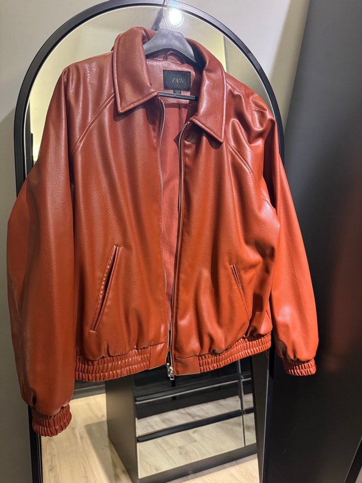 Kiremit rengi, kadın deri ceket, fermuarlı. Bol kesim, bomber, uzun kollu ve midi boydadır, günlük kullanım için uygundur.