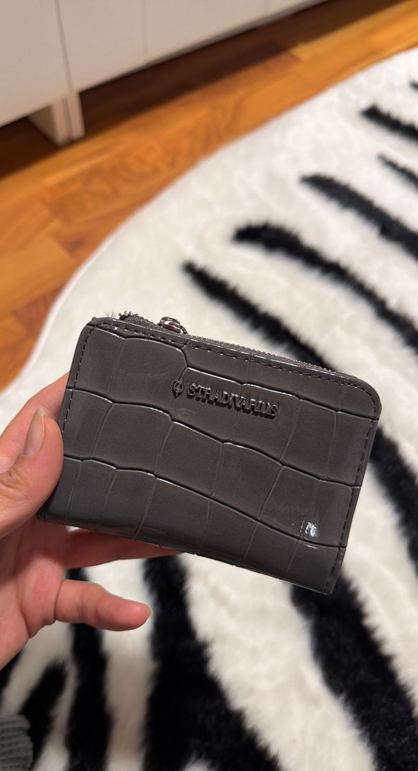 Gri renkli, deri malzemeden fermuarlı kadın cüzdanı. Yılan desenli ve günlük kullanıma uygun, trend sokak stiliyle uyumlu.