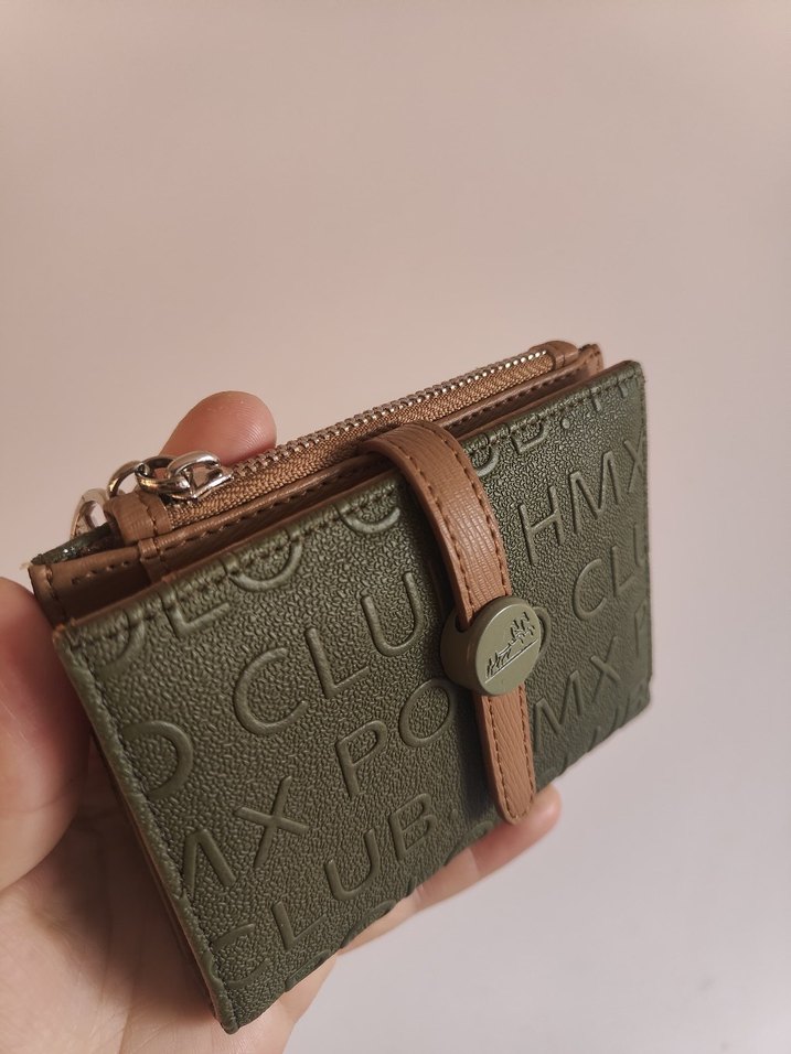 Bu kadın cüzdanı, baskılı haki deri dış yüzey, fermuarlı bölüm ve çıtçıtlı kapama ile trend ve günlük Paris tarzını bir araya getiriyor.