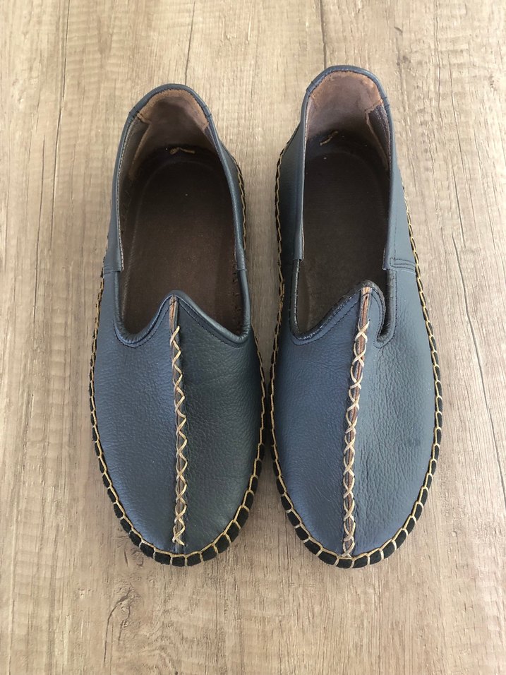 Gri renkte, deri malzemeden yapılmış kadın espadril ayakkabılar. Minimalist ve bohem tarzlarla uyumlu, günlük kullanıma uygun, sade ve şık bir tasarıma sahiptir. Üst ve taban kenarlarında görünür dikiş detayları bulunur.