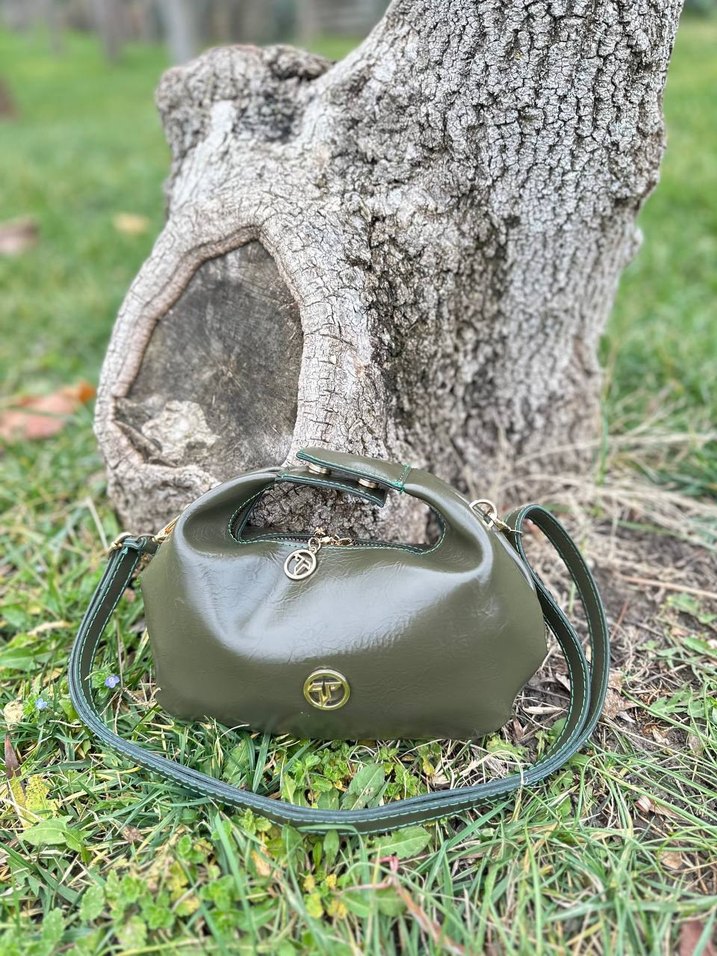 Kadın derisi, haki renkte kemerli ve yılan desenli çanta. Minimalist tarzda, dış mekan kullanımı için uygun. Trendy casual görünüme uyum sağlar.