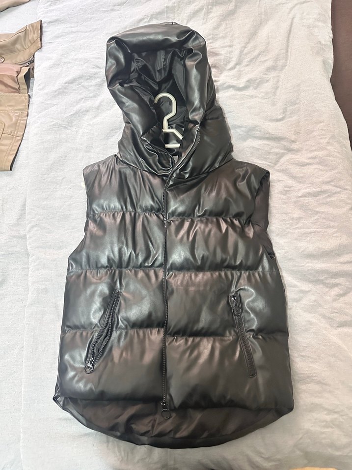 Kadınlar için siyah, deri materyalden yapılmış, yüksek yakalı ve fermuarlı cepleri bulunan şişme kapüşonlu yelek. Sokak modasına uygun, rahat ve şık bir tasarım.