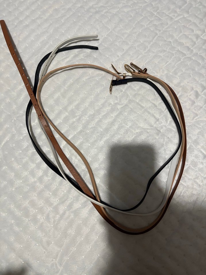 Bej, siyah ve kahverengi tokalı kadın deri kemer seti. Minimalist ve bohem tarz, moda takipçilerine uygun.