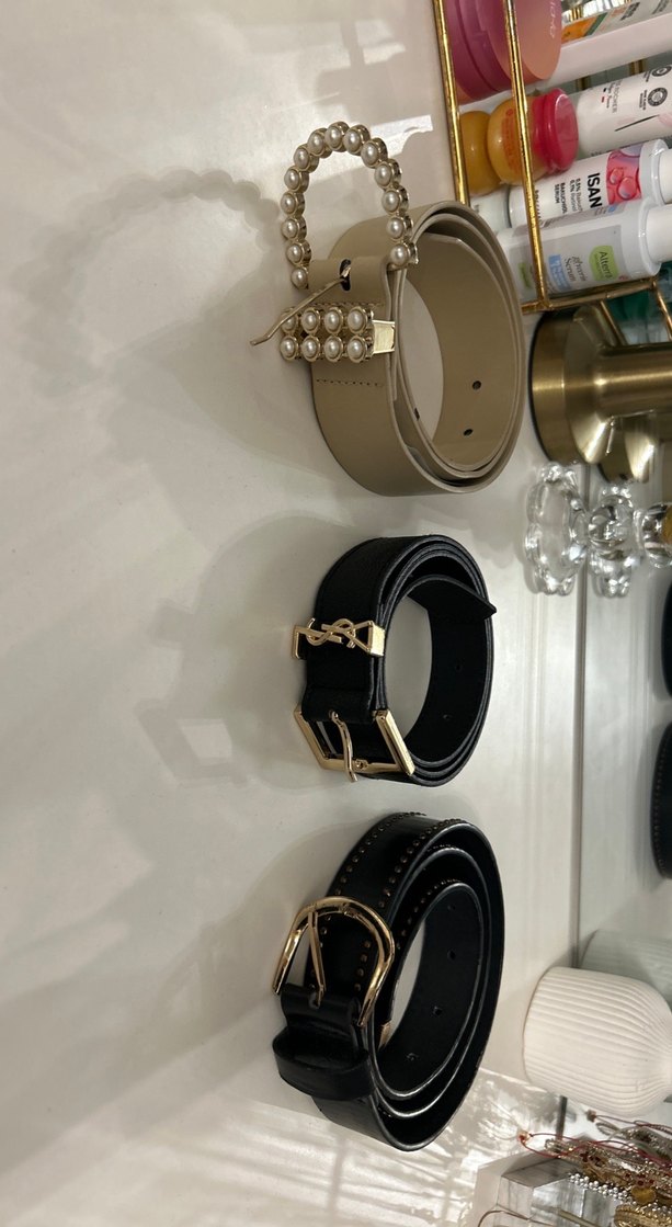 Üç adet kadın deri kemer, koyu renklerde ve gold tokalı, çağdaş ve modaya uygun tasarımlarla Paris tarzına uyum sağlar. Hepsi tek fiyat