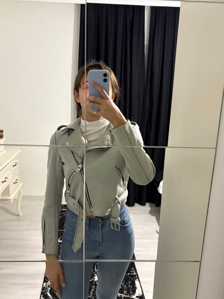 yüksek yakalı ve uzun kollu, kemerli bel detaylı dar kesim kadın deri ceket. Günlük kullanıma uygun şık bir sokak stili ceket.