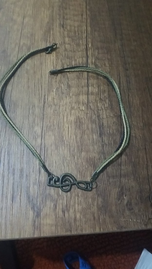 Kadın kolyesi, deri müzik detaylı ve haki tonunda, üzerine nota sembolü bulunur. Normal uzunlukta, günlük kullanım için uygun, minimal ve bohem tarzda. 40 cm