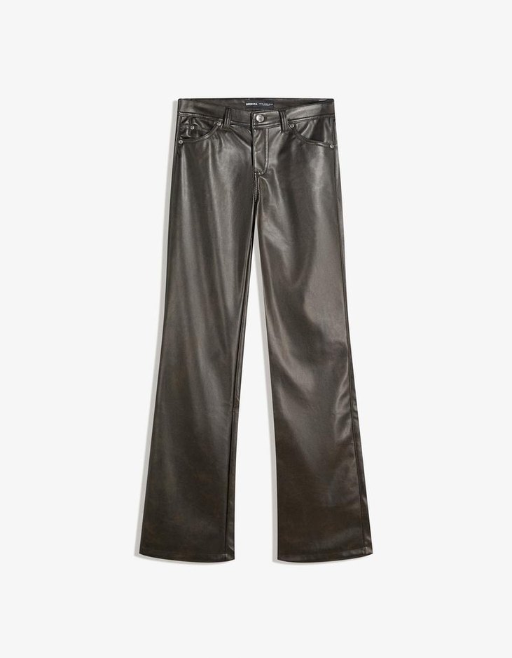Kadınlar için deri pantolon, regular fit ve kemerli. Düz kesim, parlak, desensiz yüzeye sahip, günlük sokak stili için uygundur. 34 beden bershka