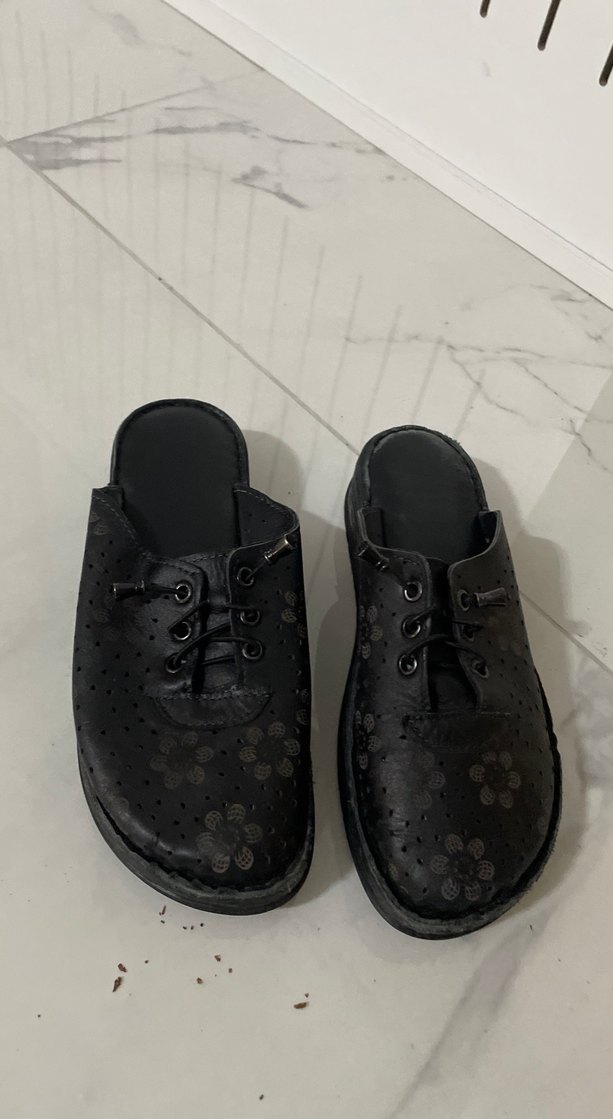 Siyah dolgu topuklu ayakkabılar, gotik tarzda, tokalı ve kauçuk tabanlı. Minimalist ve desensiz, günlük kullanıma uygun.