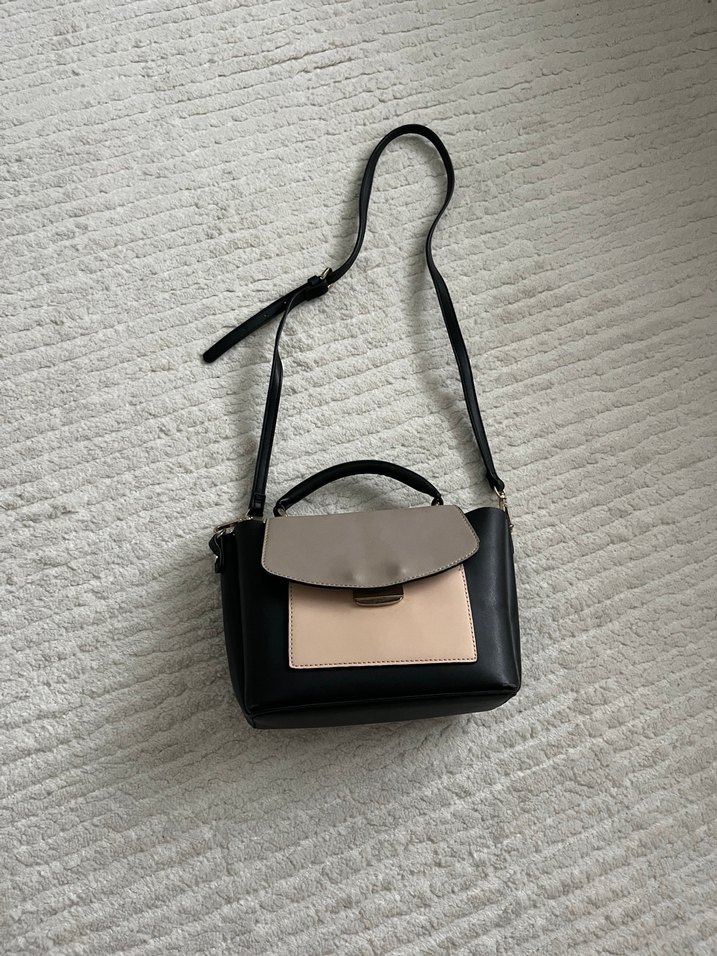 Siyah ve gri deri, tokalı kapaklı, ayarlanabilir askılı modern kadın çantası, günlük kullanım için uygundur.