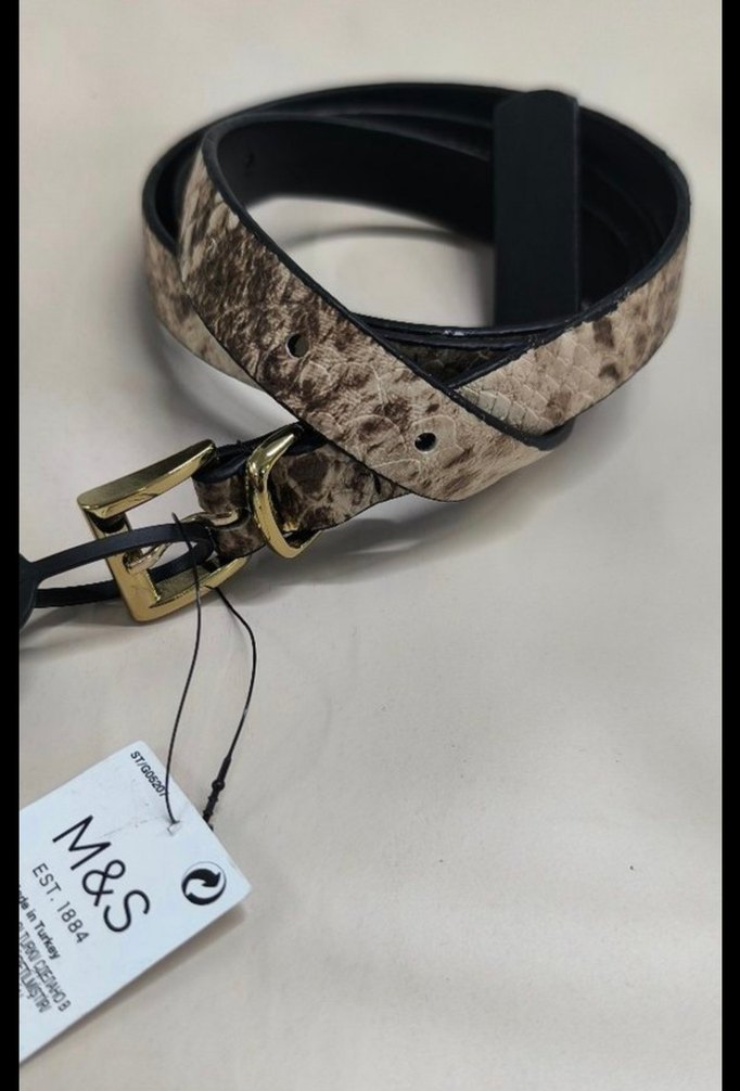 Kadınlar için tokalı, çağdaş tarzda deri kemer. Kahverengi ve gri desenli, Paris esintili gündelik şıklık için uygundur.