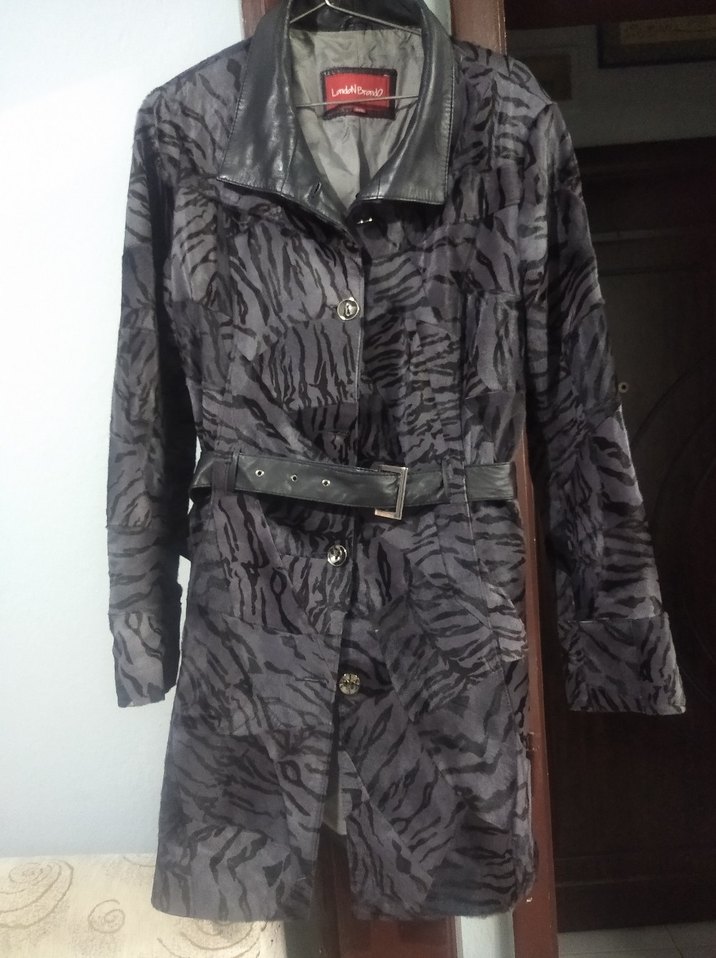 Uzun, gri deri zebra desenli trençkot, kemerli bel ve kesik yaka ile sokak tarzı goth görünüm sunar. Regular kesim ve uzun kolludur. beden 2Xl yazıyor.