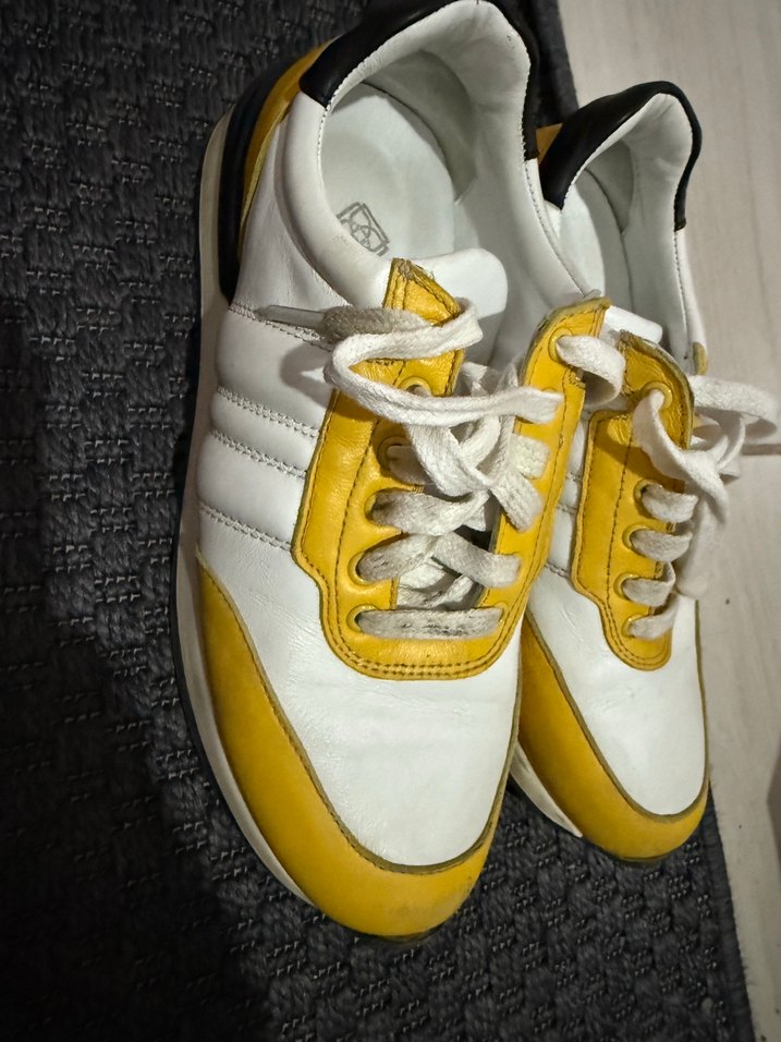 Kadın spor ayakkabıları, sarı ve gri detaylarla bağcıklı ve dolgu topuklu tasarıma sahiptir, spor ve sokak stilini birleştirir. ♀️