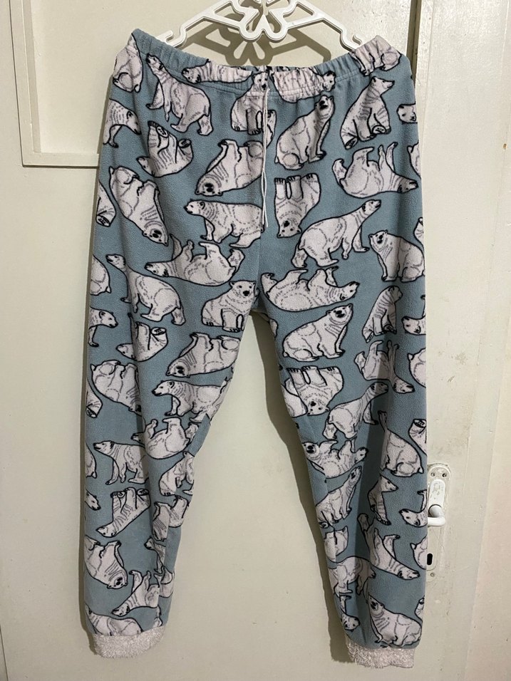 kadınlar için gri renkte, rahat kesimli, örgü kumaştan yapılmış, kutup ayısı desenli pijama altı. Elastik bel bandı ve midi boy uzunluğa sahiptir.