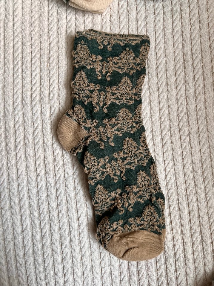 Kadın yumuşak triko kumaştan, koyu kahverengi y desenli çorap. Burun ve topuk kısımları kahverengidir.